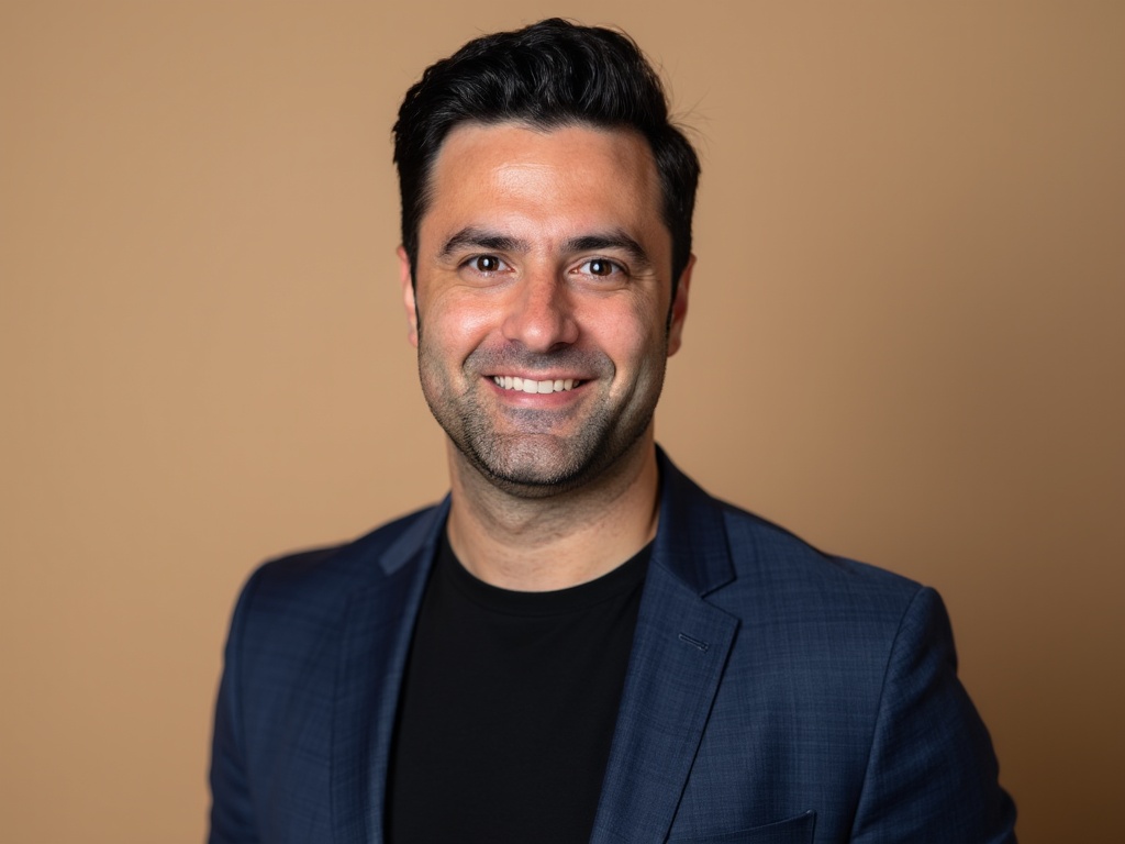 A close-up portrait of a man wearing a tailored navy blazer over a black crewneck shirt, posed again...
