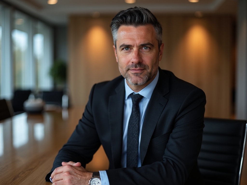 A male executive in a classic black suit, seated with one arm resting on a conference table, looking...