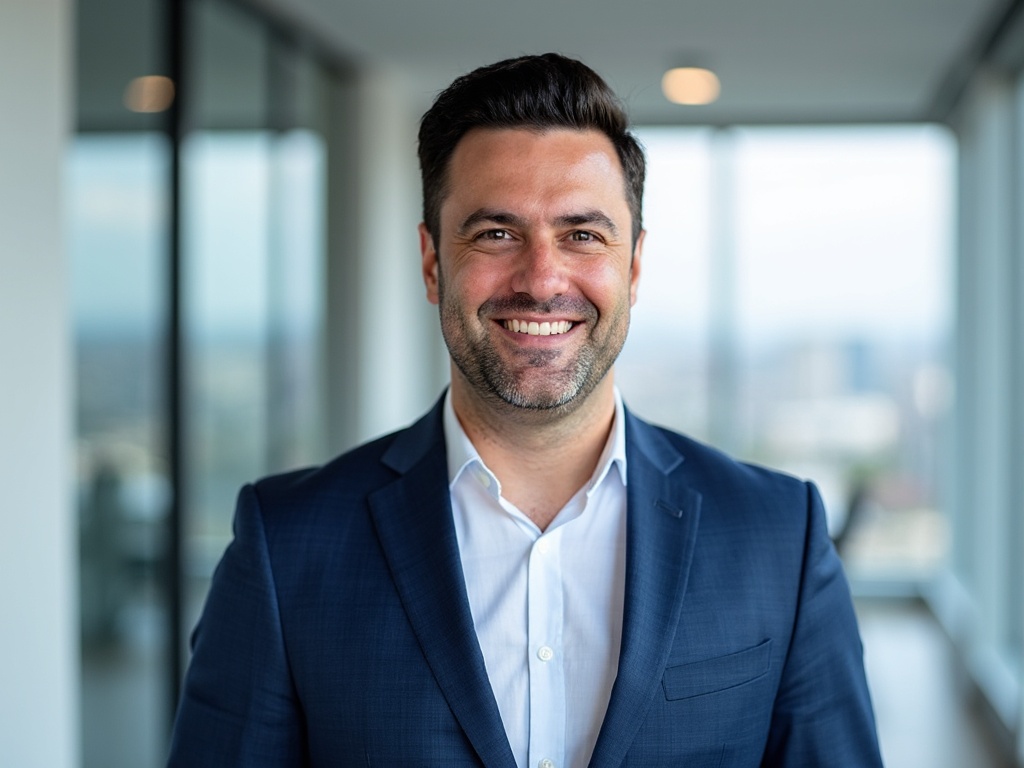 A well-groomed man in a fitted navy blue suit and white dress shirt, standing in front of a floor-to...