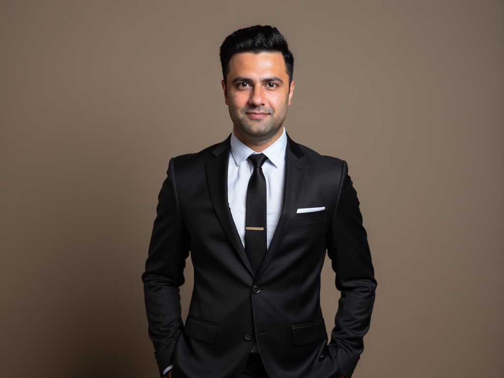 A sharply dressed man in a black suit and tie, standing confidently against a solid taupe background...