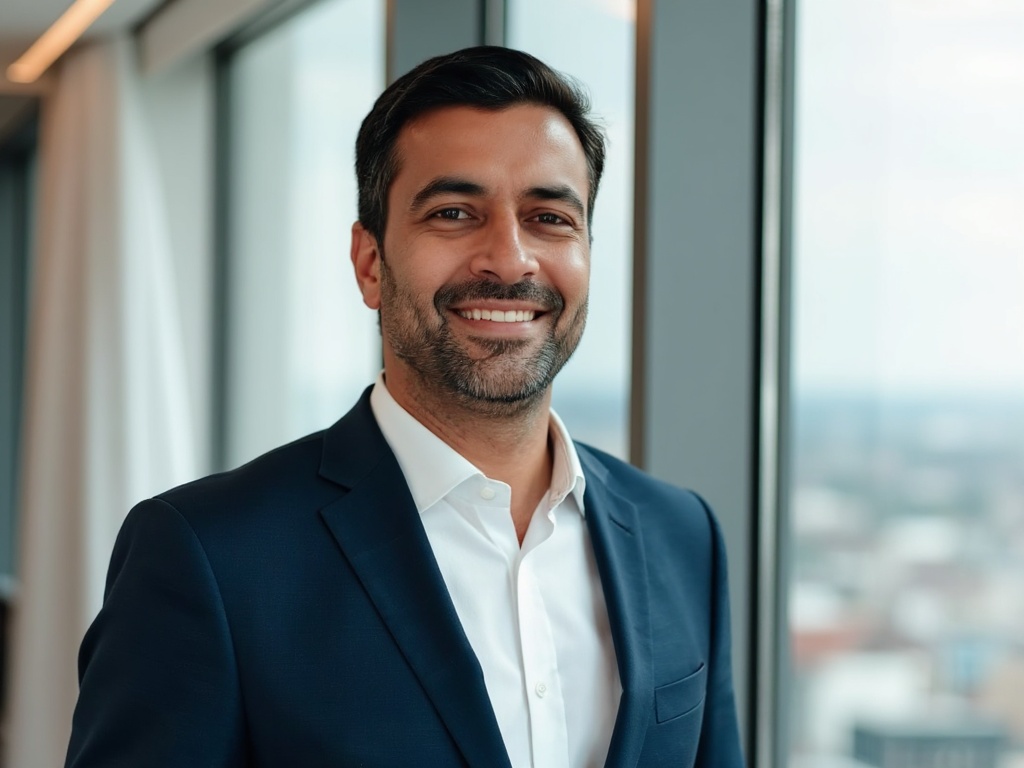 A well-groomed man in a fitted navy blue suit and white dress shirt, standing in front of a floor-to...