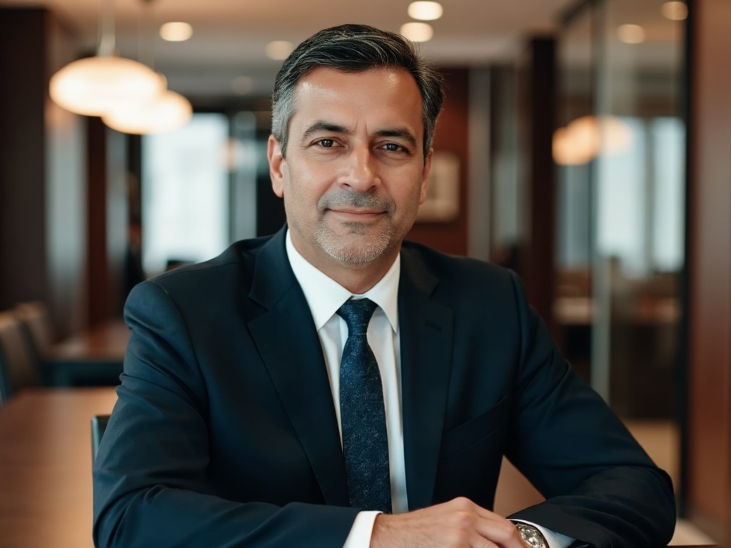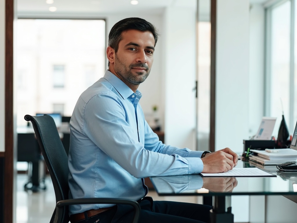 A professional man seated at a glass desk in a contemporary office space, dressed in a light blue dr...