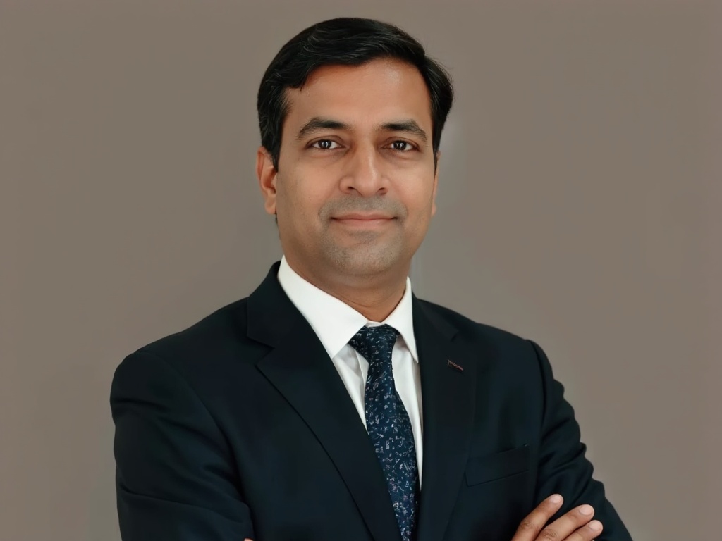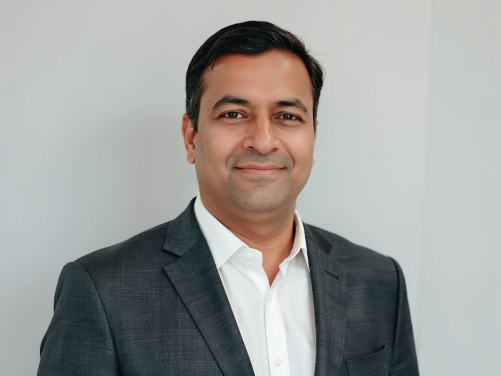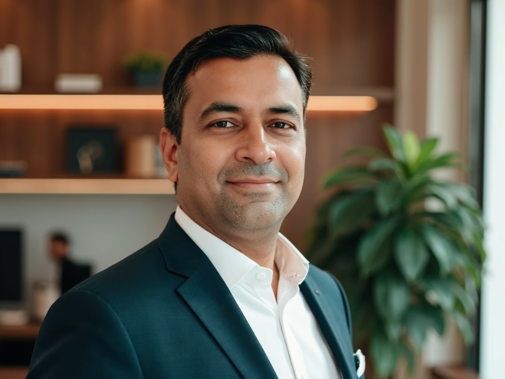 A modern corporate portrait of a man in a dark green suit and white shirt, posed in front of a styli...