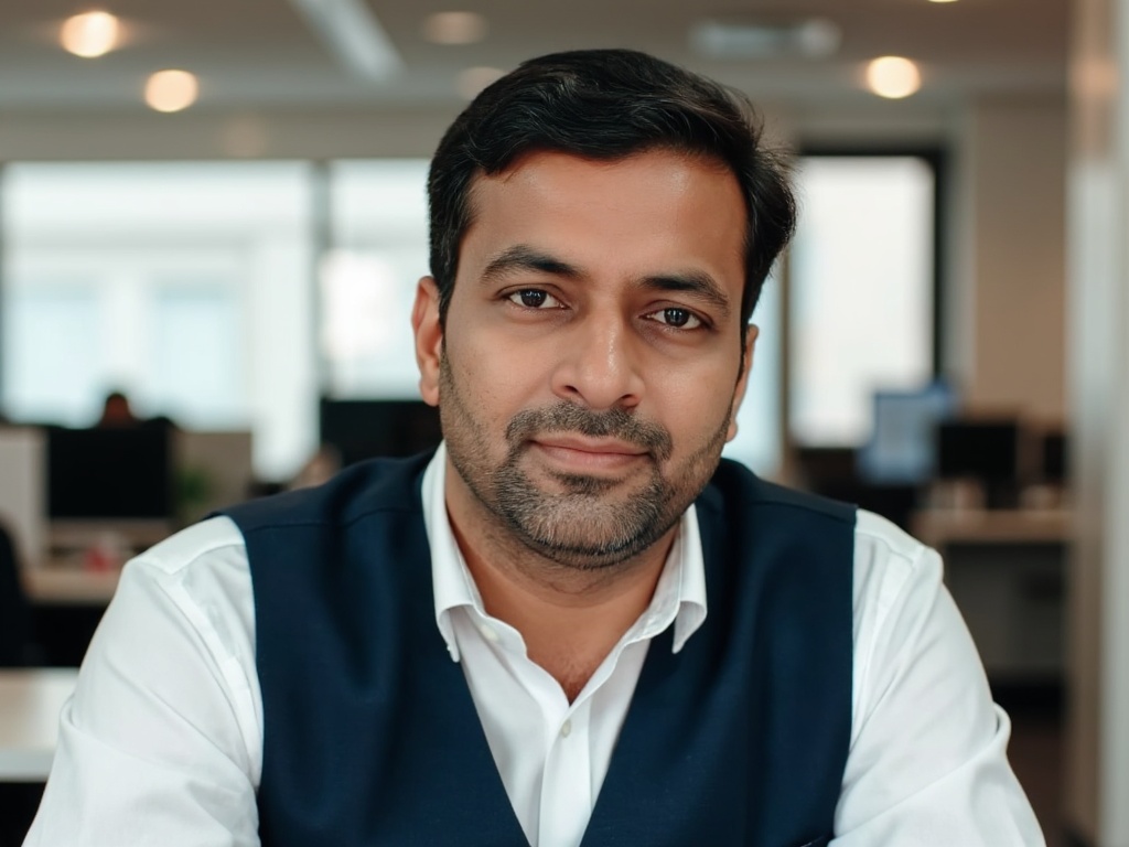 A candid-style portrait of a man in a white shirt and navy vest, leaning slightly against a desk in ...