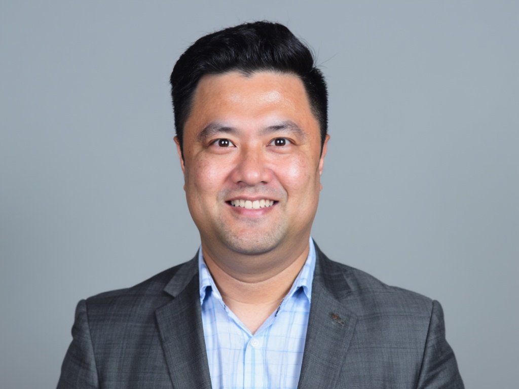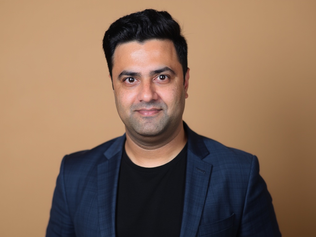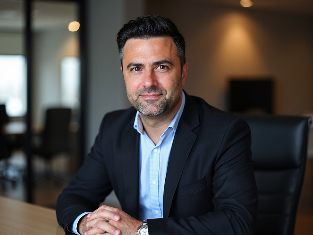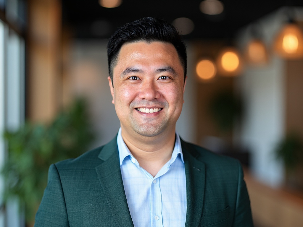 A modern corporate portrait of a man in a dark green suit and white shirt, posed in front of a styli...