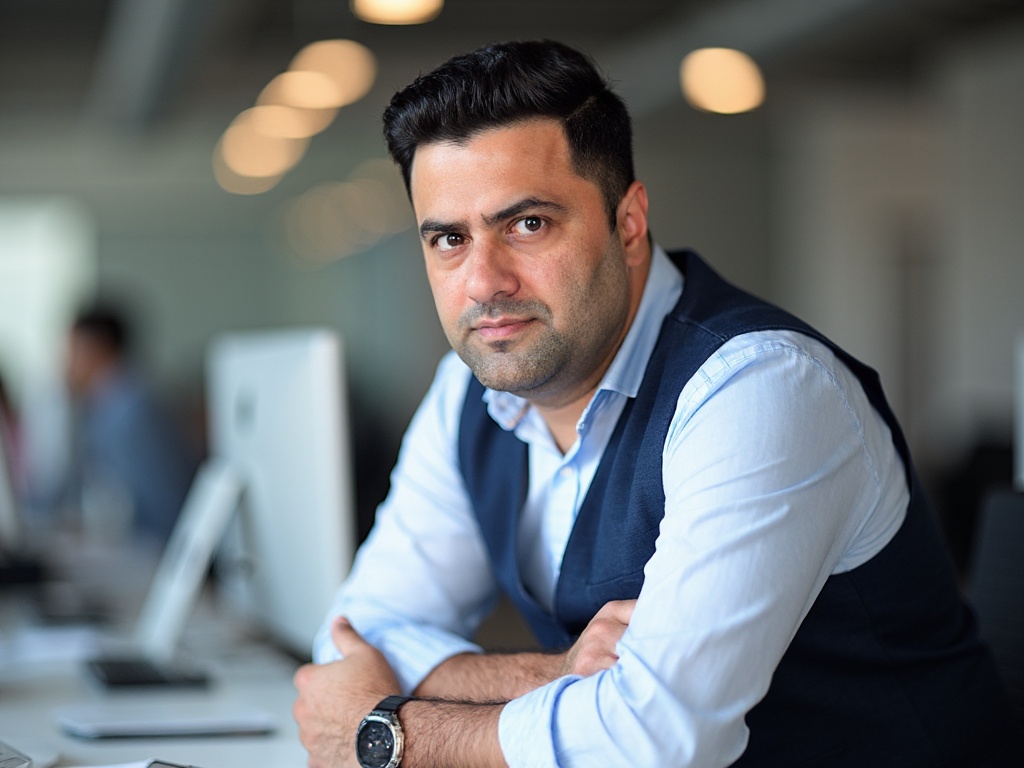 A candid-style portrait of a man in a white shirt and navy vest, leaning slightly against a desk in ...