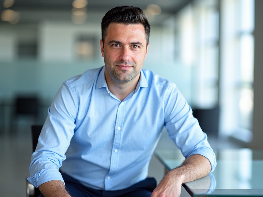 A professional man seated at a glass desk in a contemporary office space, dressed in a light blue dr...