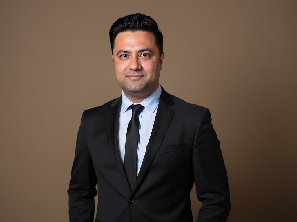 A sharply dressed man in a black suit and tie, standing confidently against a solid taupe background...