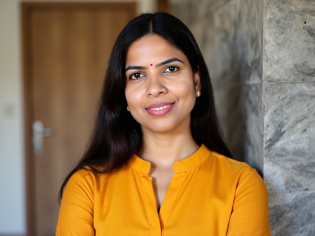 A close-up portrait of an Indian woman in a mustard yellow formal kurti with structured collars, sta...