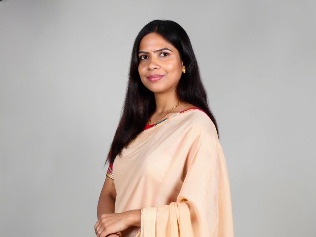 An Indian woman wearing a simple, elegant cotton saree in neutral tones with a matching blouse, stan...