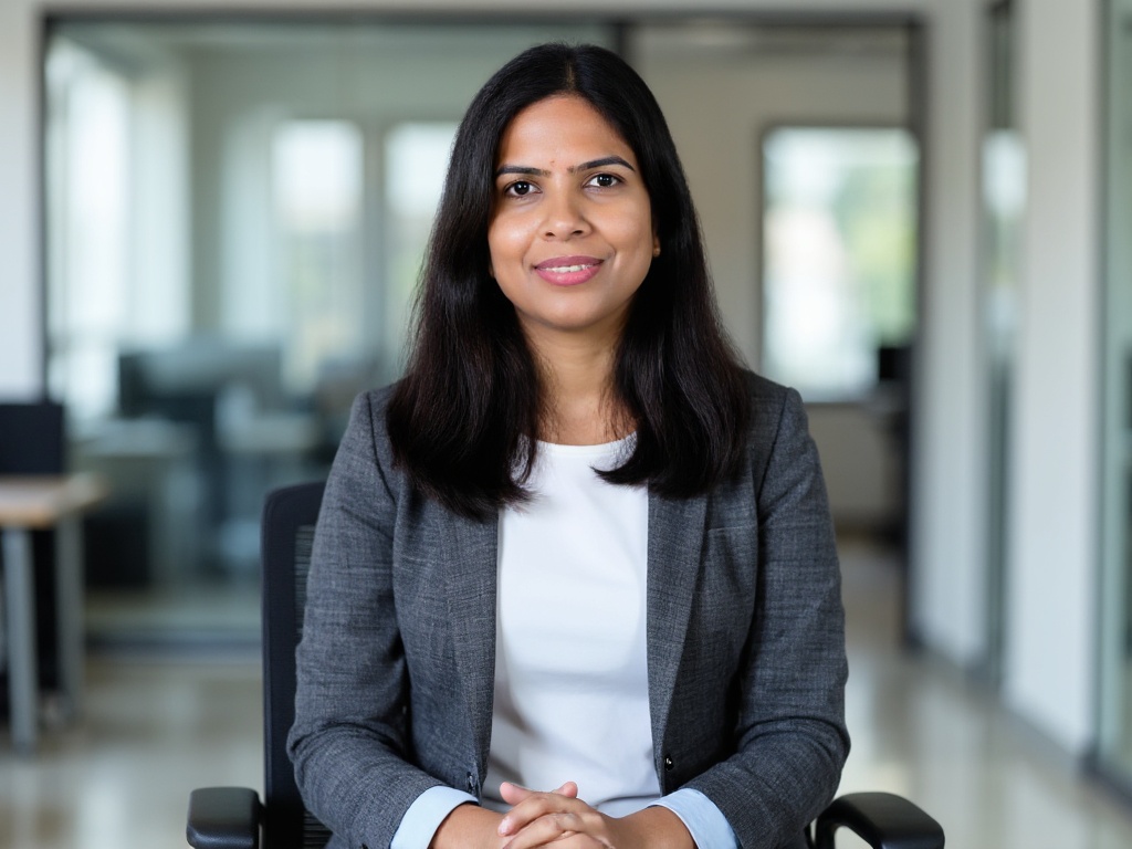 A professional Indian woman in a charcoal gray pant-suit, with a light blue shirt underneath, sittin...