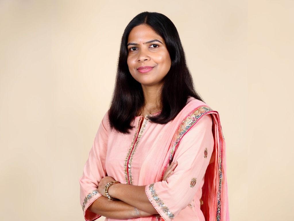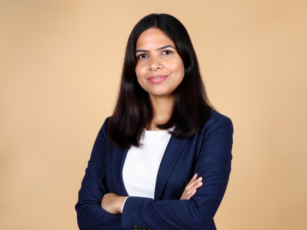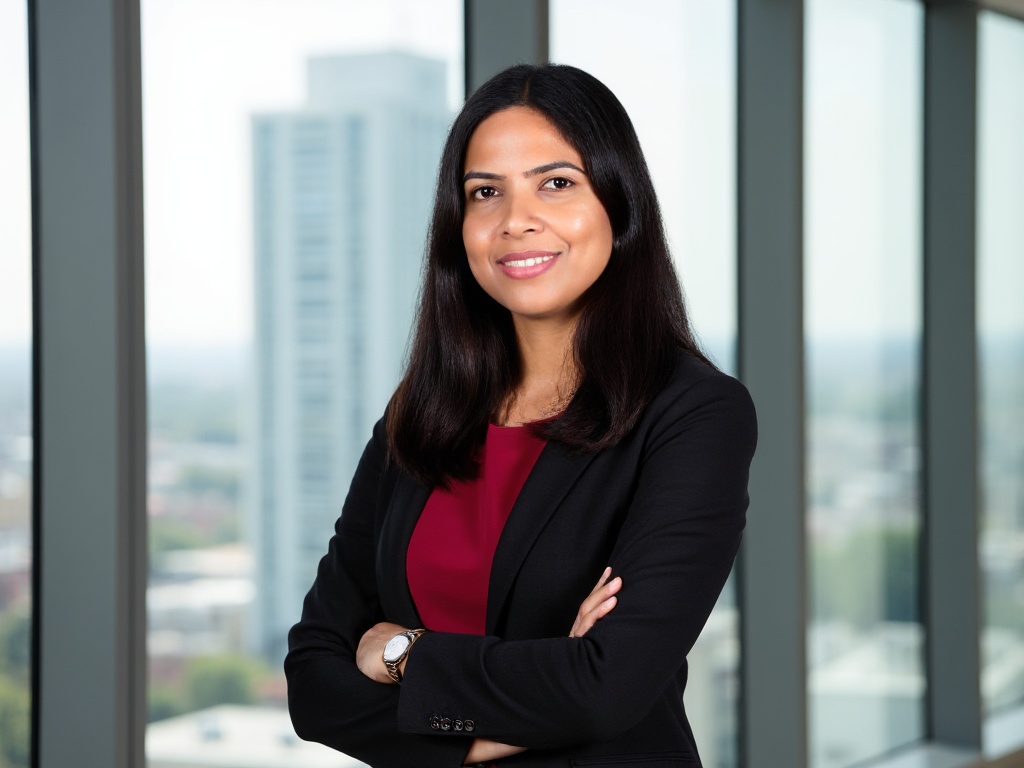 A professional Indian woman in a fitted black blazer and maroon top, standing in front of large wind...