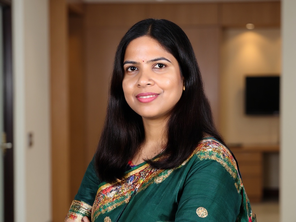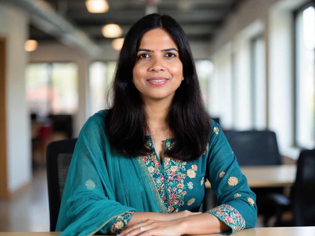A modern corporate headshot of an Indian woman in a dark green saree with minimalistic gold jewelry,...