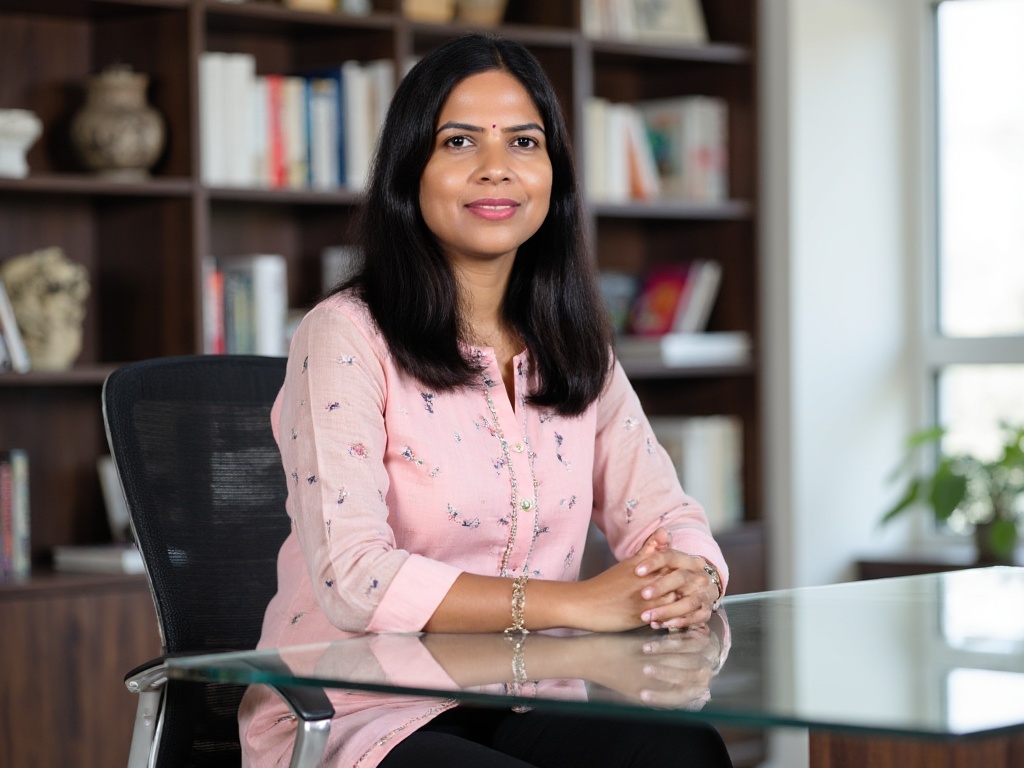 An Indian businesswoman seated at a sleek glass desk, wearing a pale pink chikankari kurta with form...