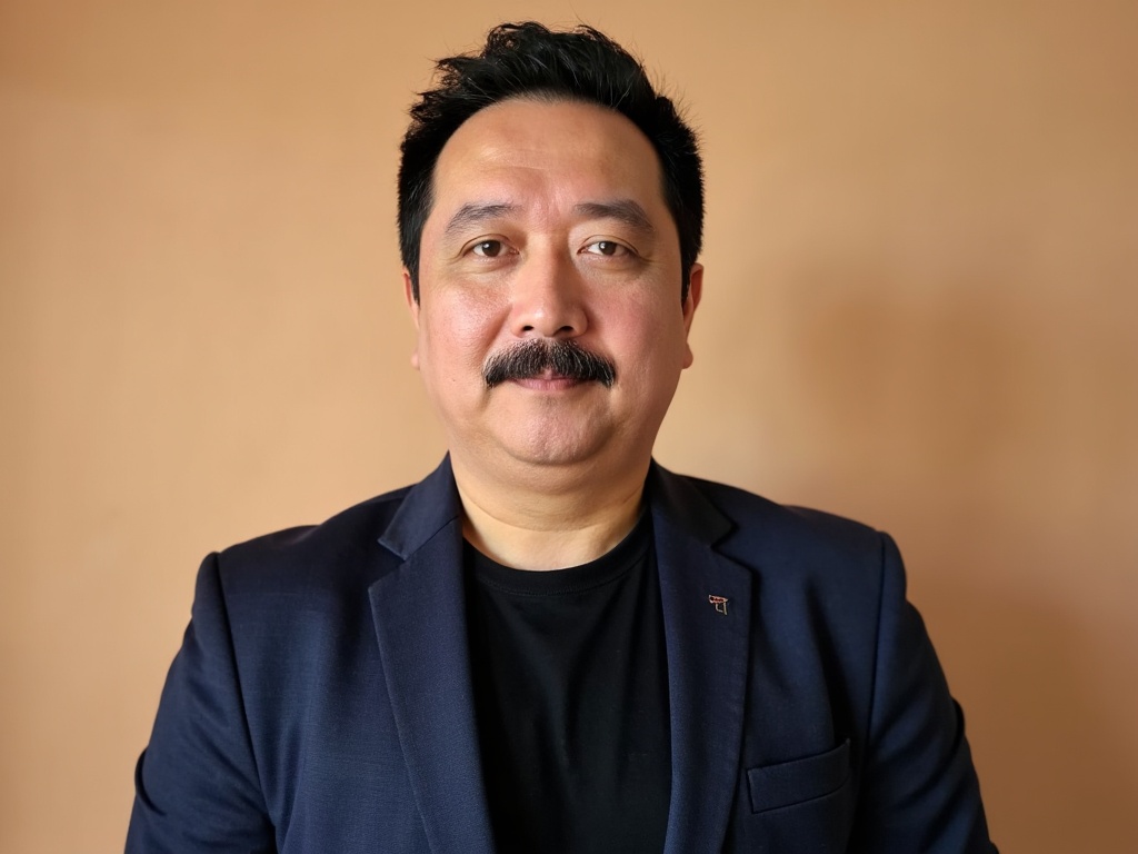 A close-up portrait of a man wearing a tailored navy blazer over a black crewneck shirt, posed again...