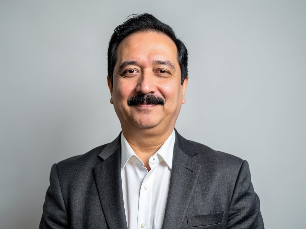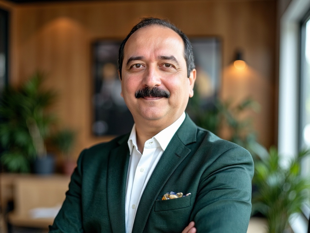 A modern corporate portrait of a man in a dark green suit and white shirt, posed in front of a styli...