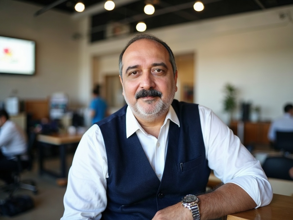 A candid-style portrait of a man in a white shirt and navy vest, leaning slightly against a desk in ...