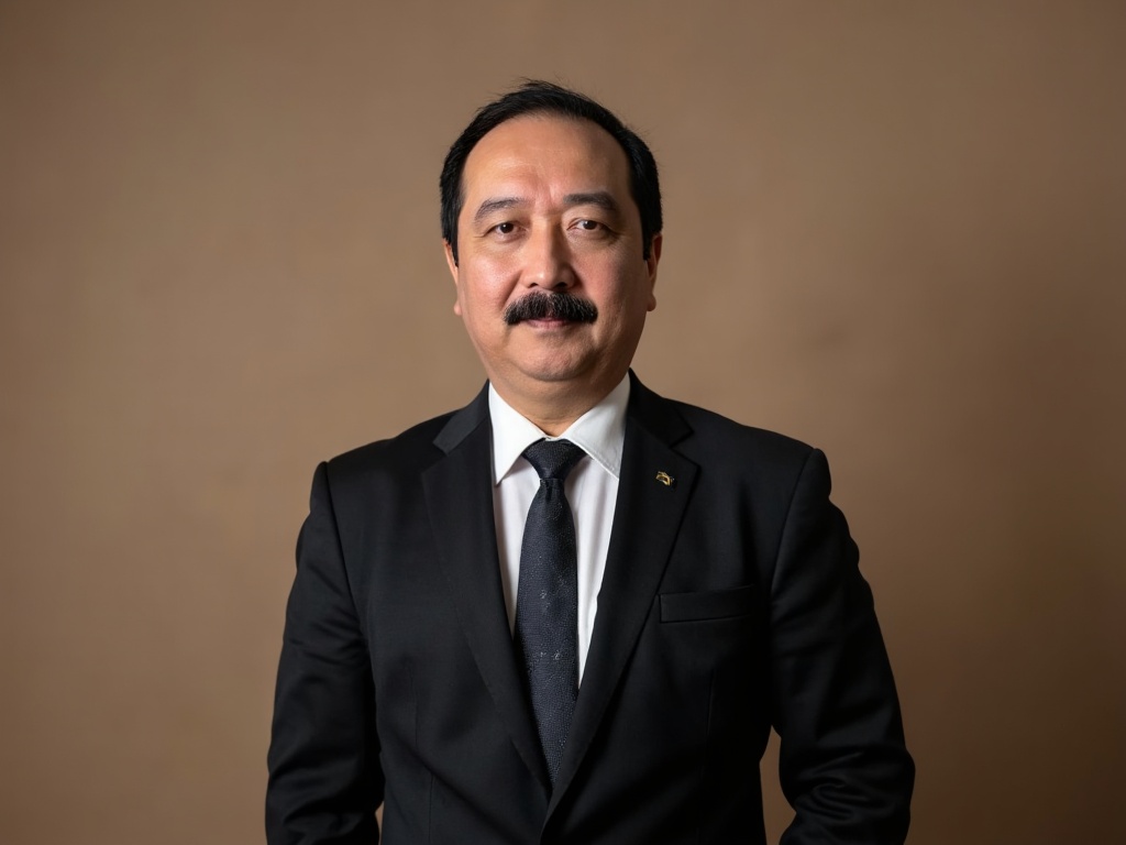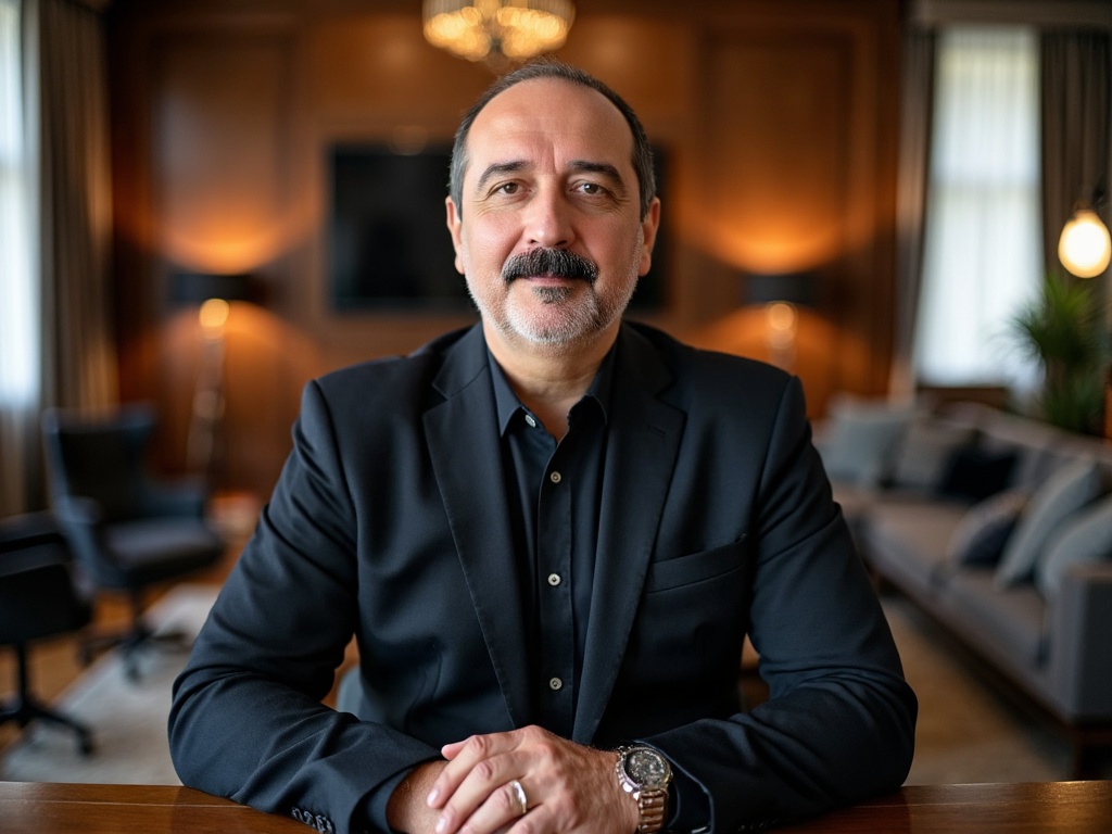 A male executive in a classic black suit, seated with one arm resting on a conference table, looking...