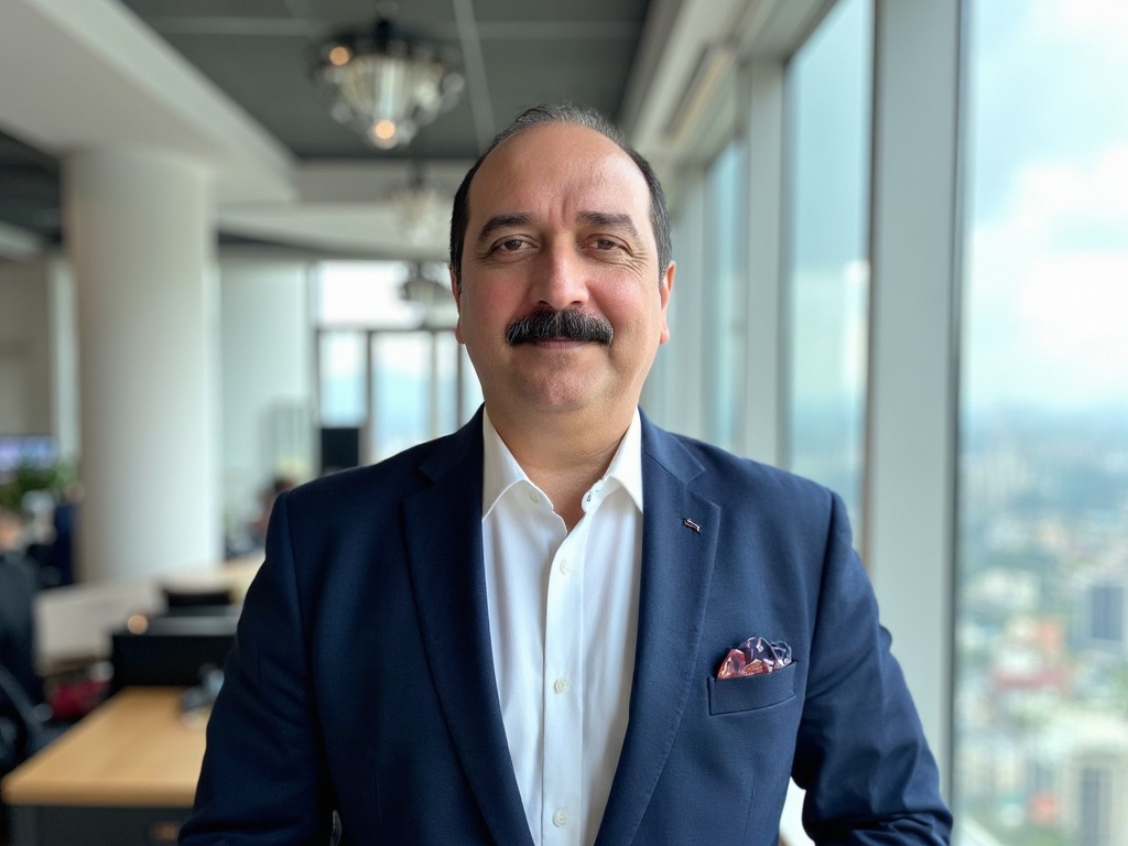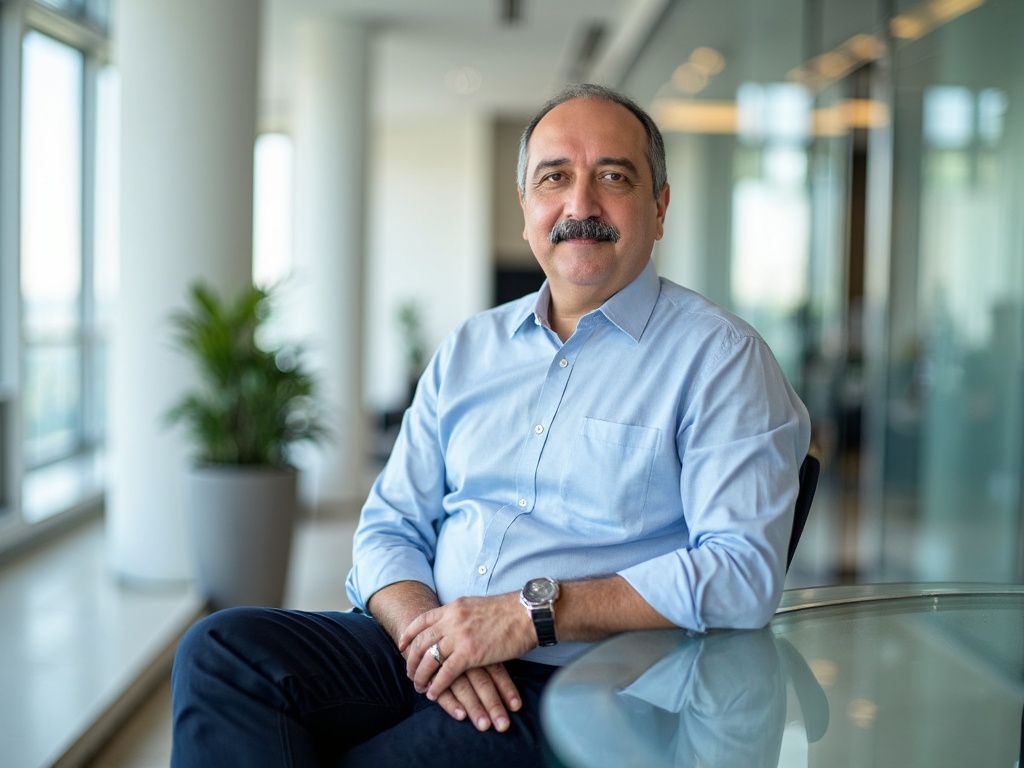 A professional man seated at a glass desk in a contemporary office space, dressed in a light blue dr...