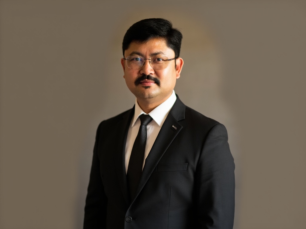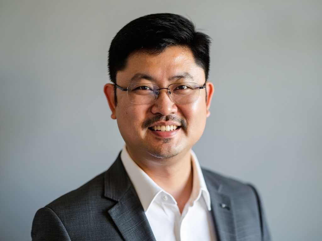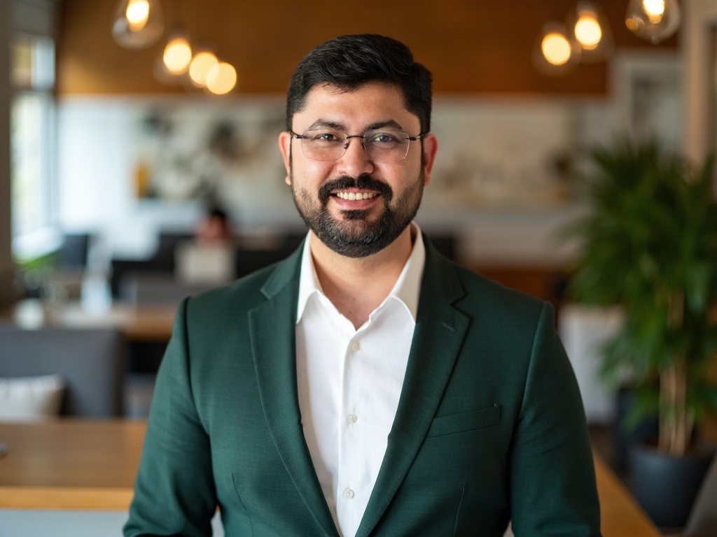 A modern corporate portrait of a man in a dark green suit and white shirt, posed in front of a styli...