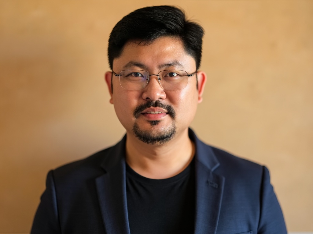 A close-up portrait of a man wearing a tailored navy blazer over a black crewneck shirt, posed again...