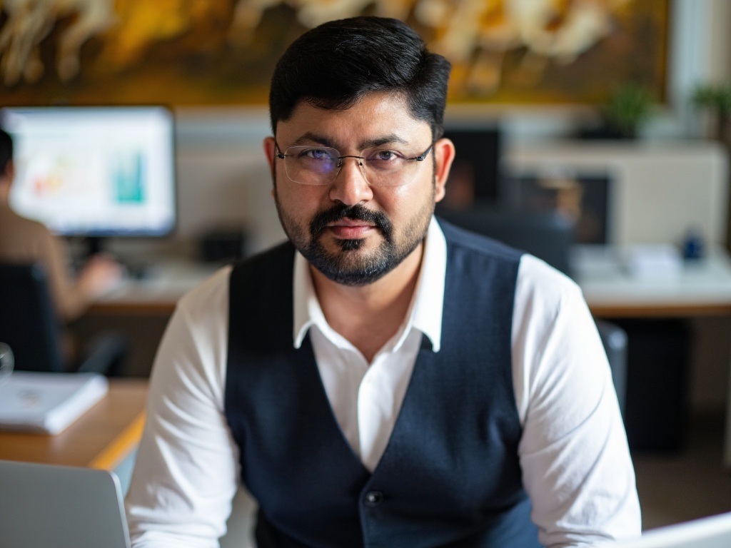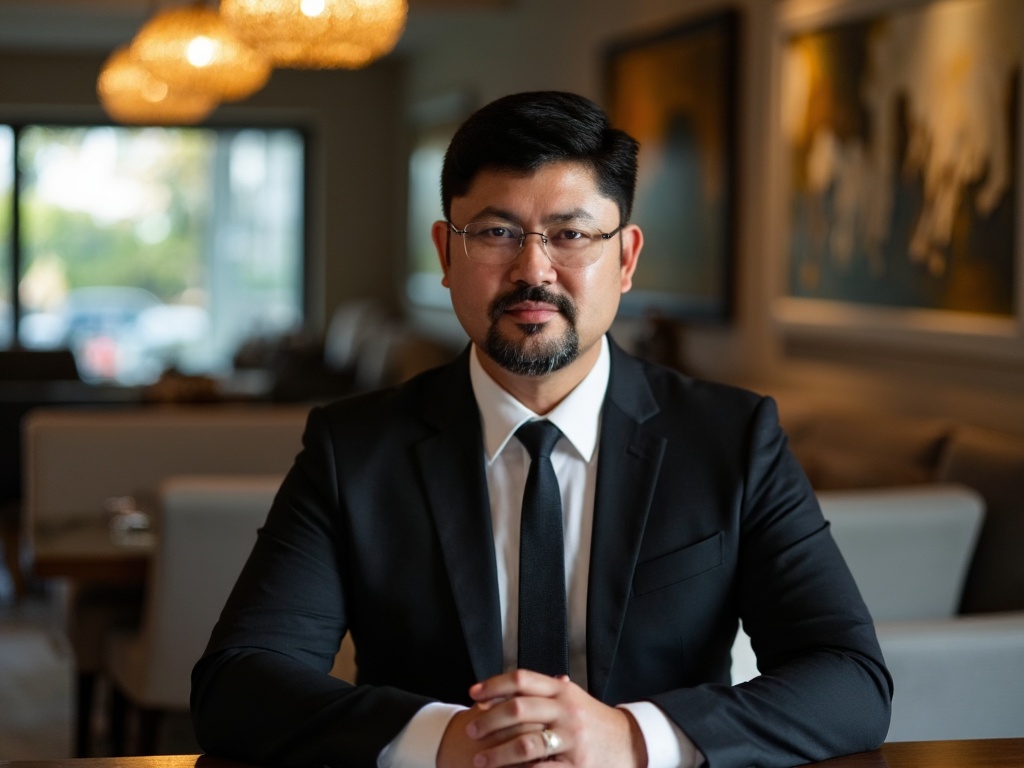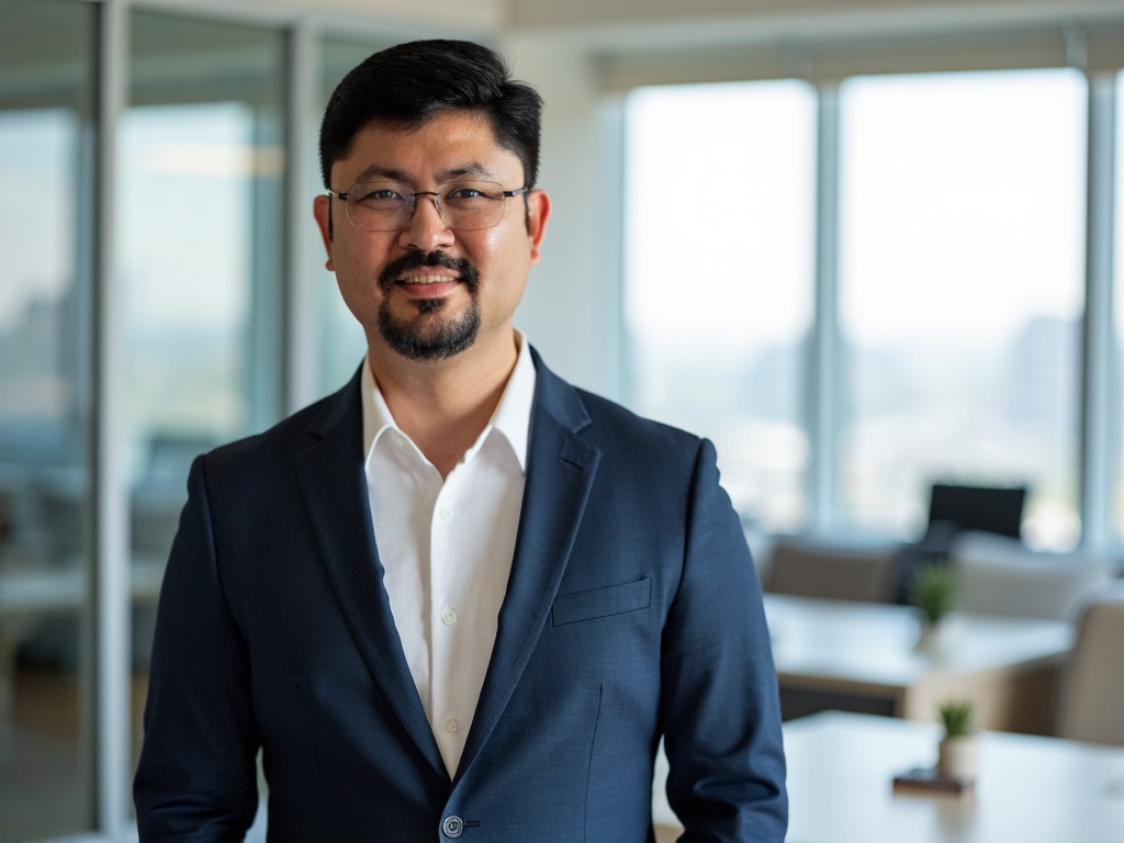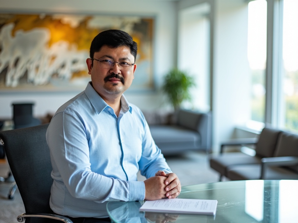 A professional man seated at a glass desk in a contemporary office space, dressed in a light blue dr...