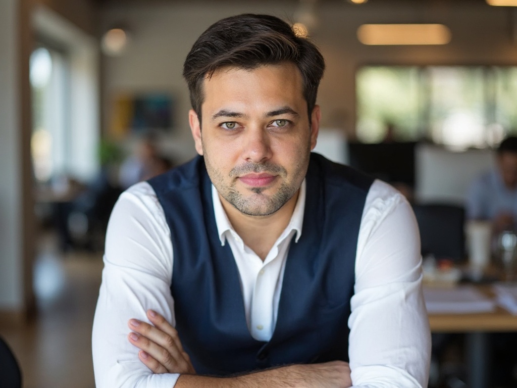 A candid-style portrait of a man in a white shirt and navy vest, leaning slightly against a desk in ...