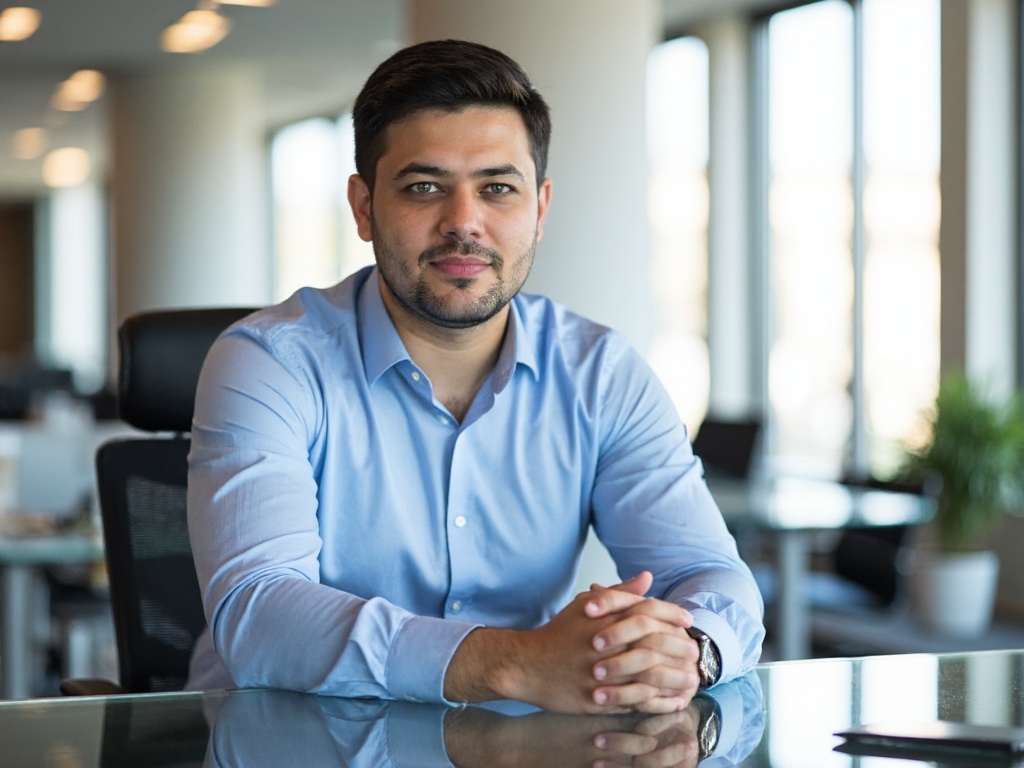 A professional man seated at a glass desk in a contemporary office space, dressed in a light blue dr...