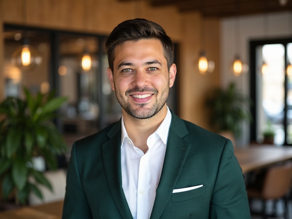 A modern corporate portrait of a man in a dark green suit and white shirt, posed in front of a styli...