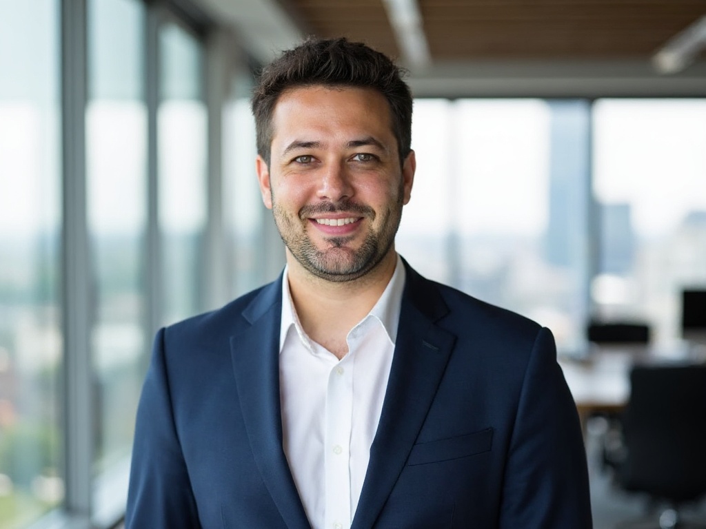 A well-groomed man in a fitted navy blue suit and white dress shirt, standing in front of a floor-to...