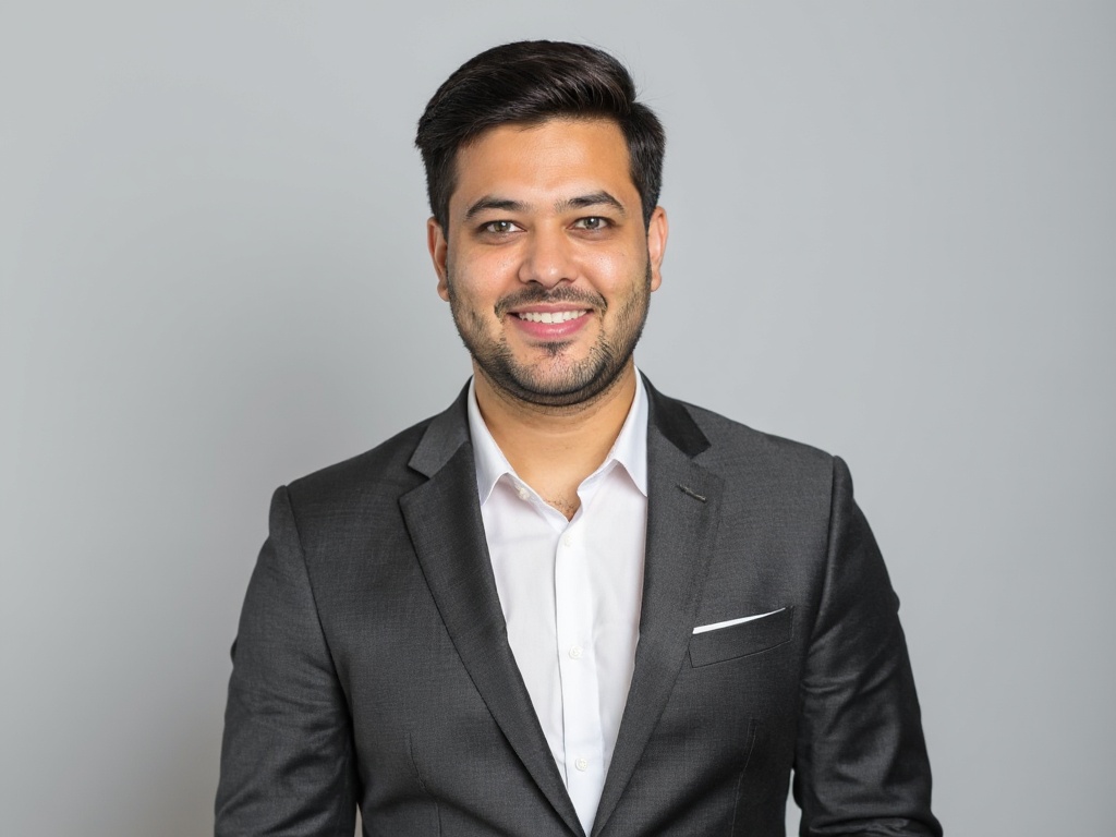 A professional headshot of a confident man in a charcoal gray suit and crisp white shirt, no tie, st...