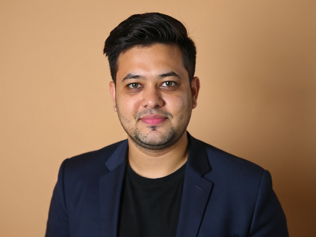 A sharply dressed man in a black suit and tie, standing confidently against a solid taupe background...