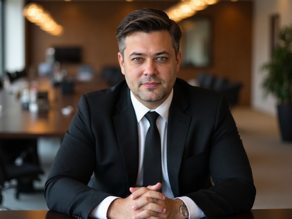 A male executive in a classic black suit, seated with one arm resting on a conference table, looking...
