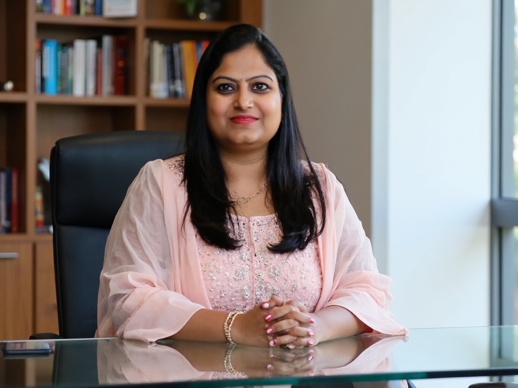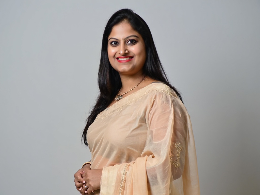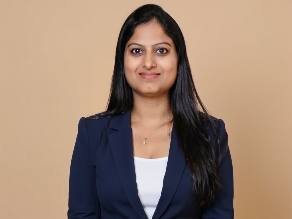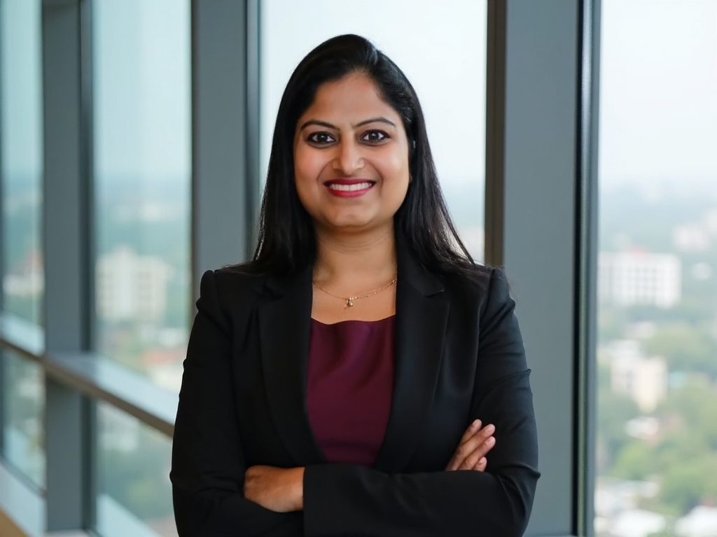 A professional Indian woman in a fitted black blazer and maroon top, standing in front of large wind...
