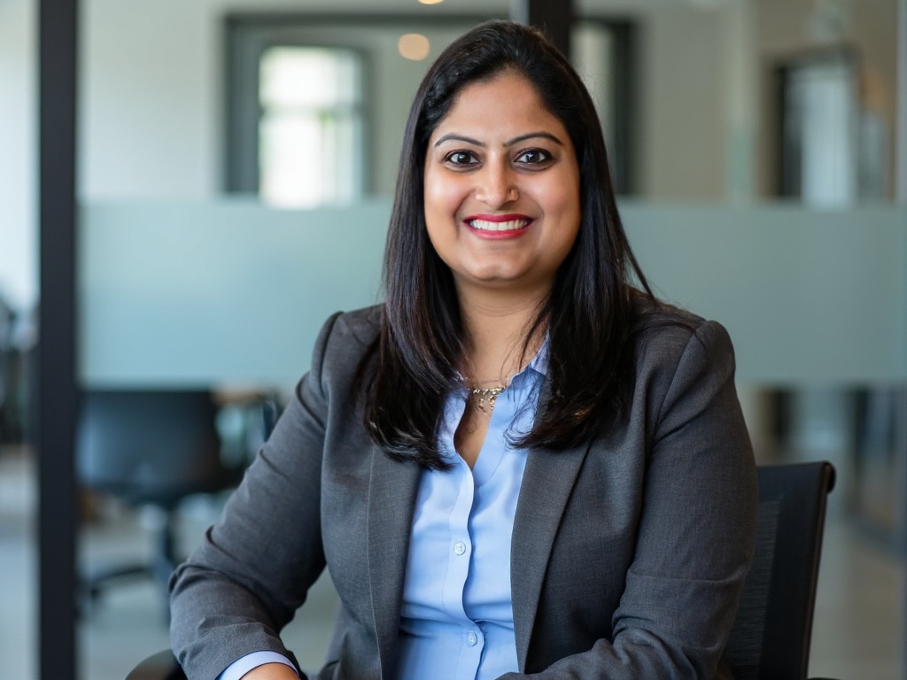 A professional Indian woman in a charcoal gray pant-suit, with a light blue shirt underneath, sittin...