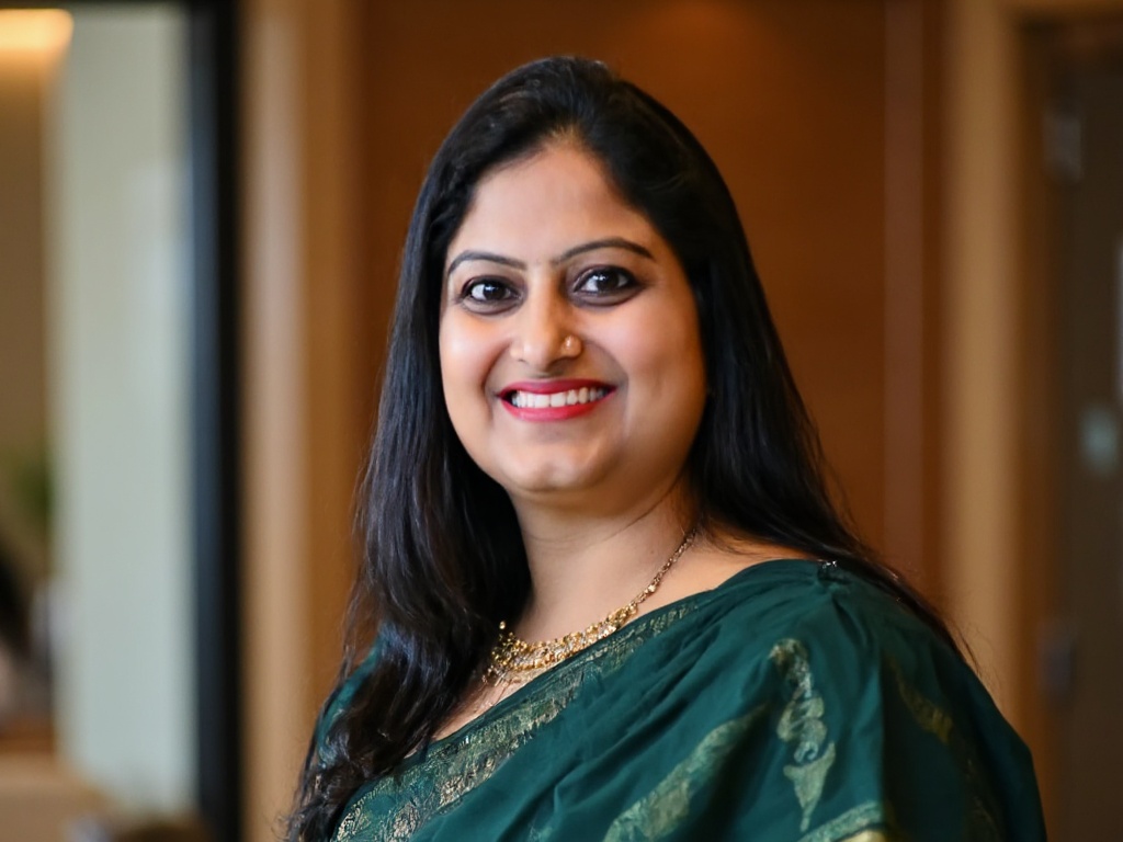 A modern corporate headshot of an Indian woman in a dark green saree with minimalistic gold jewelry,...