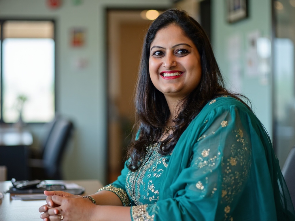A candid-style portrait of an Indian woman in a teal-colored formal salwar suit with a dupatta neatl...