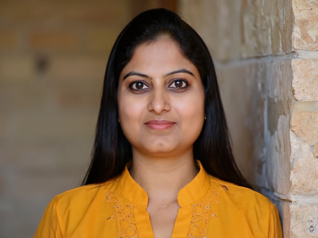 A poised Indian woman in a pastel-colored ethnic kurta with subtle embroidery, paired with minimal j...